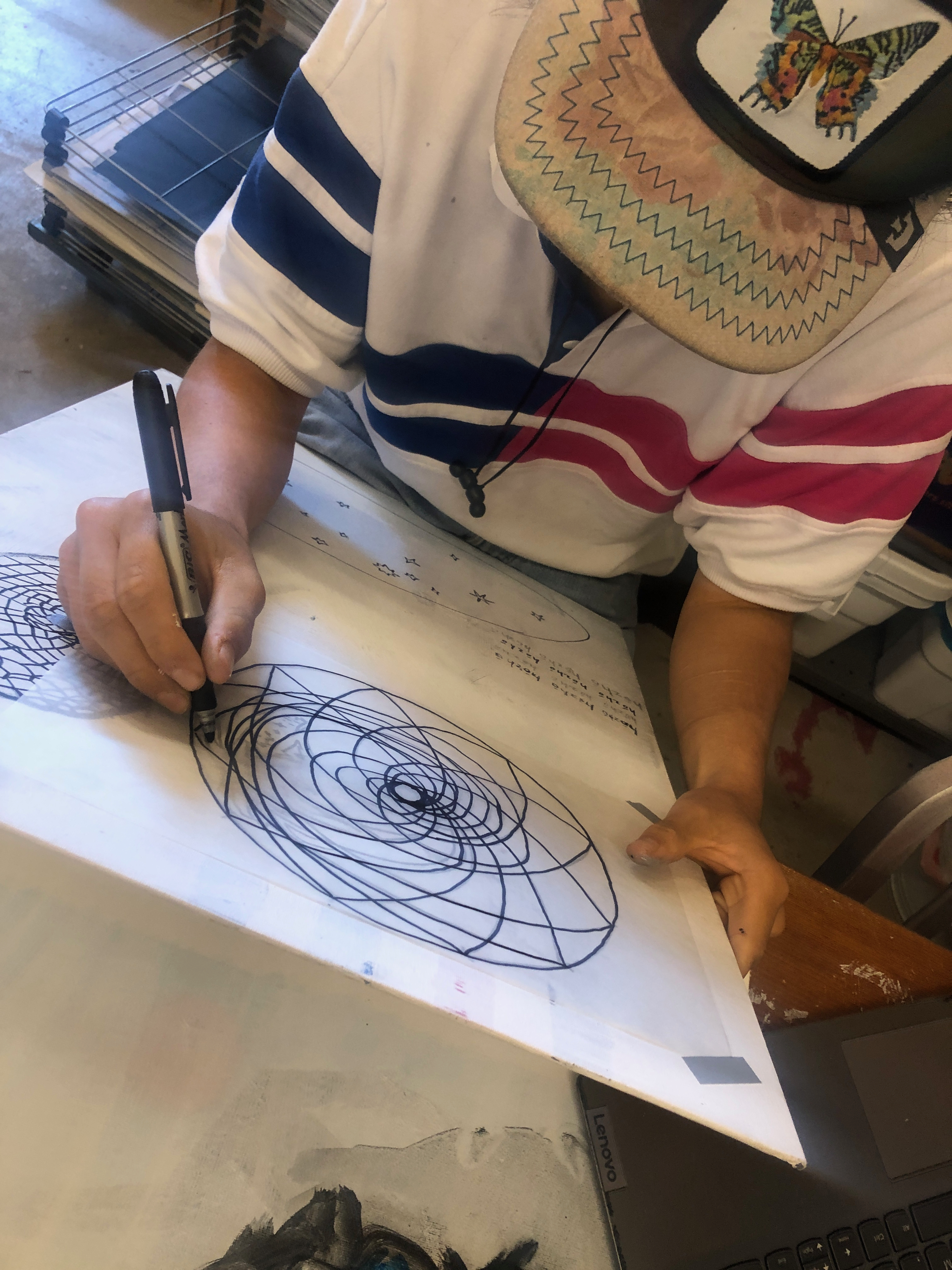 In Navajo stories, the hummingbird taught the First People how to harvest pollen for ceremonial purposes, and it is now seen as a prominent symbol for beauty and cultural teachings in Navajo art. Similar to the hummingbird, Family Spirit is teaching families how to begin their own ways of healing through a blend of homeopathic/modern techniques. In my prints the hummingbird lays on a geometric design depicting dreamcatchers, which have been used across Native cultures as heavy symbols, holding the weight of nightmares, allowing good dreams to flow through the center. It’s a spiritual symbol that isn’t often recognized for its purpose, but I wanted to draw the attention back to its meaning: mental protection.